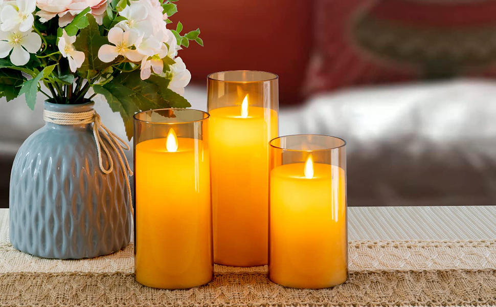 Premium LED Amber Glass Cup Pillar Candles with Real Wax with Moving Faux Wick | Battery Powered with Remote